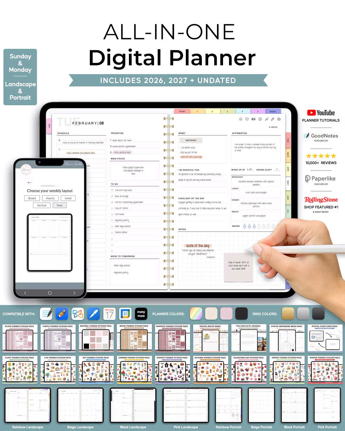 The complete digital planning solution. Includes dated versions for 2026 and 2027, plus an undated version for flexible planning. Works beautifully with GoodNotes, Notability, and other PDF annotation apps.